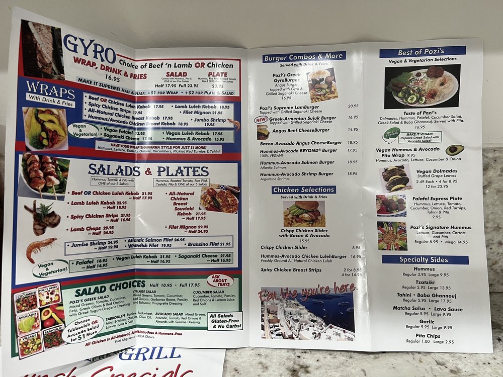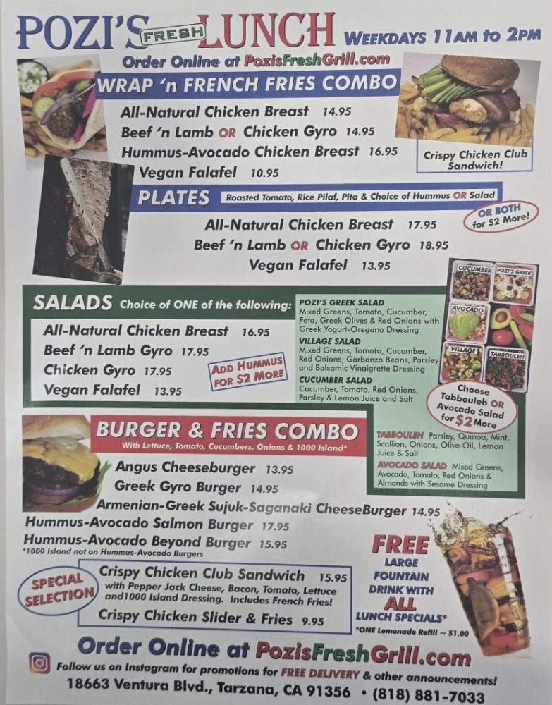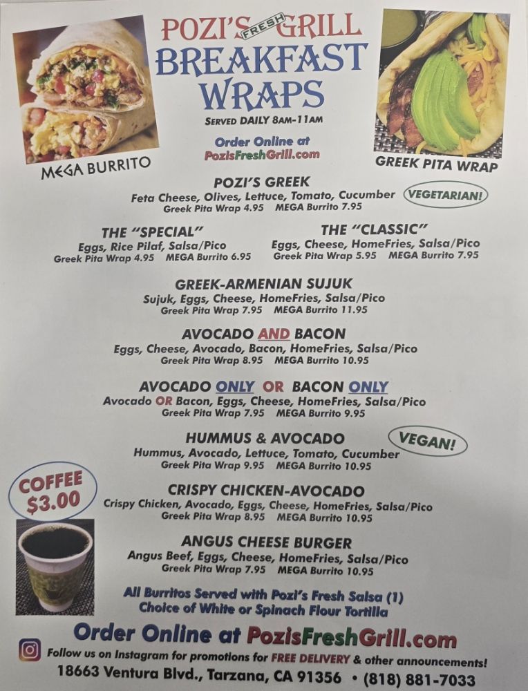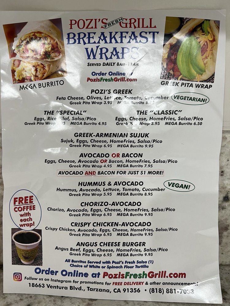 Introducing the menu at Pozi’s Fresh Grill, a Greek eatery in Tarzana, CA, offering a variety of options to suit every diner. From the flavorful Wraps Combo featuring all-natural chicken and beef/lamb gyro wraps to the satisfying Breakfast Burritos with options like beef luleh kebob and classic pork chorizo, there's something for everyone. The breakfast wraps, such as the Angus cheese burger wrap and avocado bacon wrap, promise a hearty start to your day. Customers rave about the generous portions, delicious Greek nachos, and crispy fries that are perfect for sharing. The cozy ambiance, quick service, and affordable prices make Pozi’s Fresh Grill a go-to spot for a quick and satisfying meal. Don't miss out on their diverse menu, including unique items like chili cheese fries and gelato, ensuring a delightful culinary experience every visit.